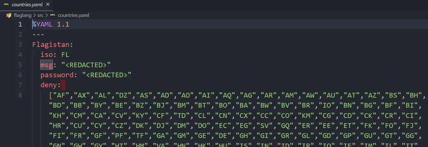 So there is a country called Flagistan and its msg and password are <REDACTED>. At the moment, I have no idea what <REDACTED> means but I guess it will be replaced with something else once it’s in production, so those could be the flags.